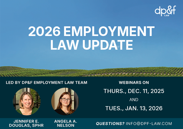 DP&F partner Jennifer E. Douglas, and employment law attorney Angela A. Nelson, will be presenting 2026 Employment Law Updates, sharing updates for California employers on December 11th, 2025 and January 13th, 2026.