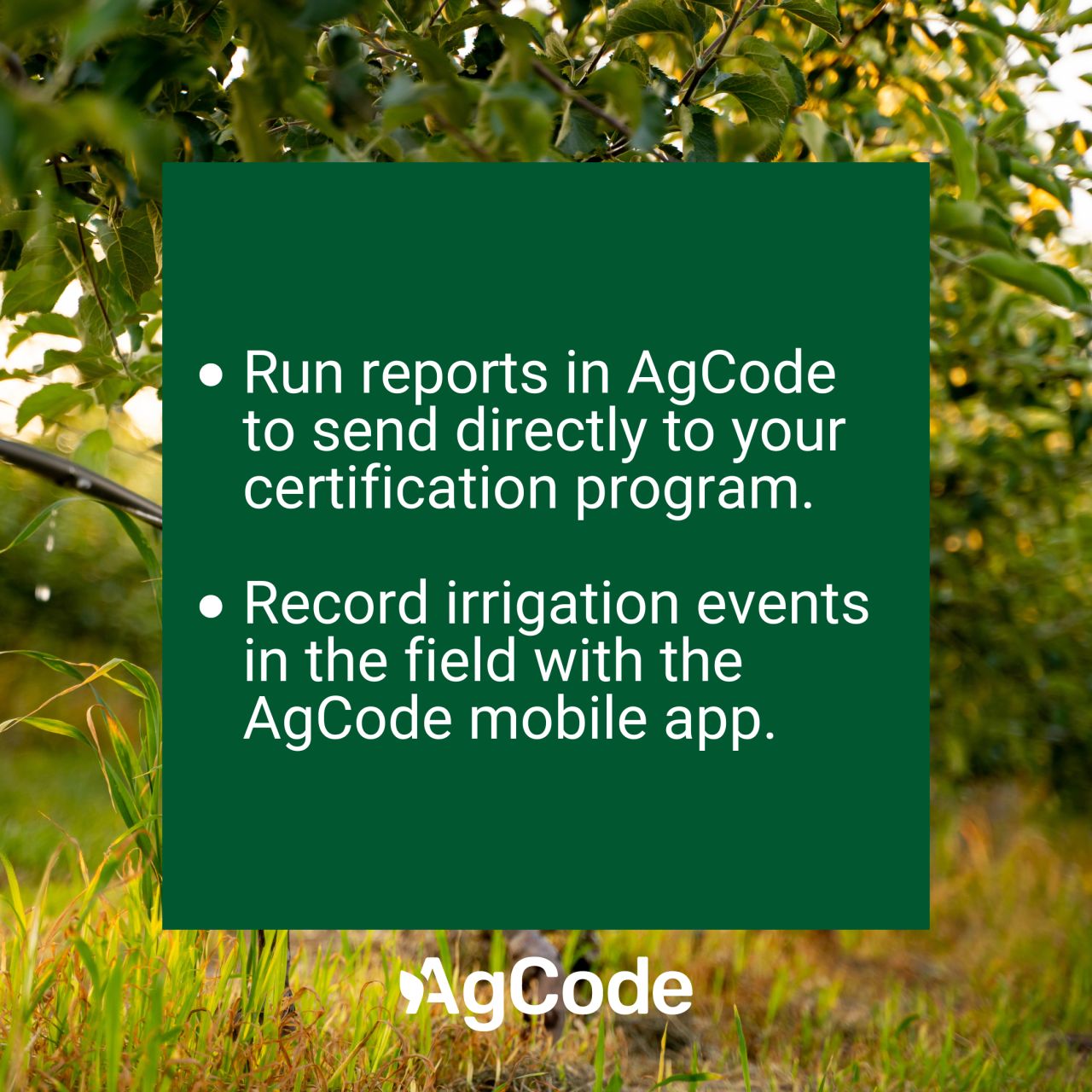 Track your irrigations seamlessly with AgCode. Whether it's for your personal use or certification reporting, reach out to your rep now to get ahead of the game.
