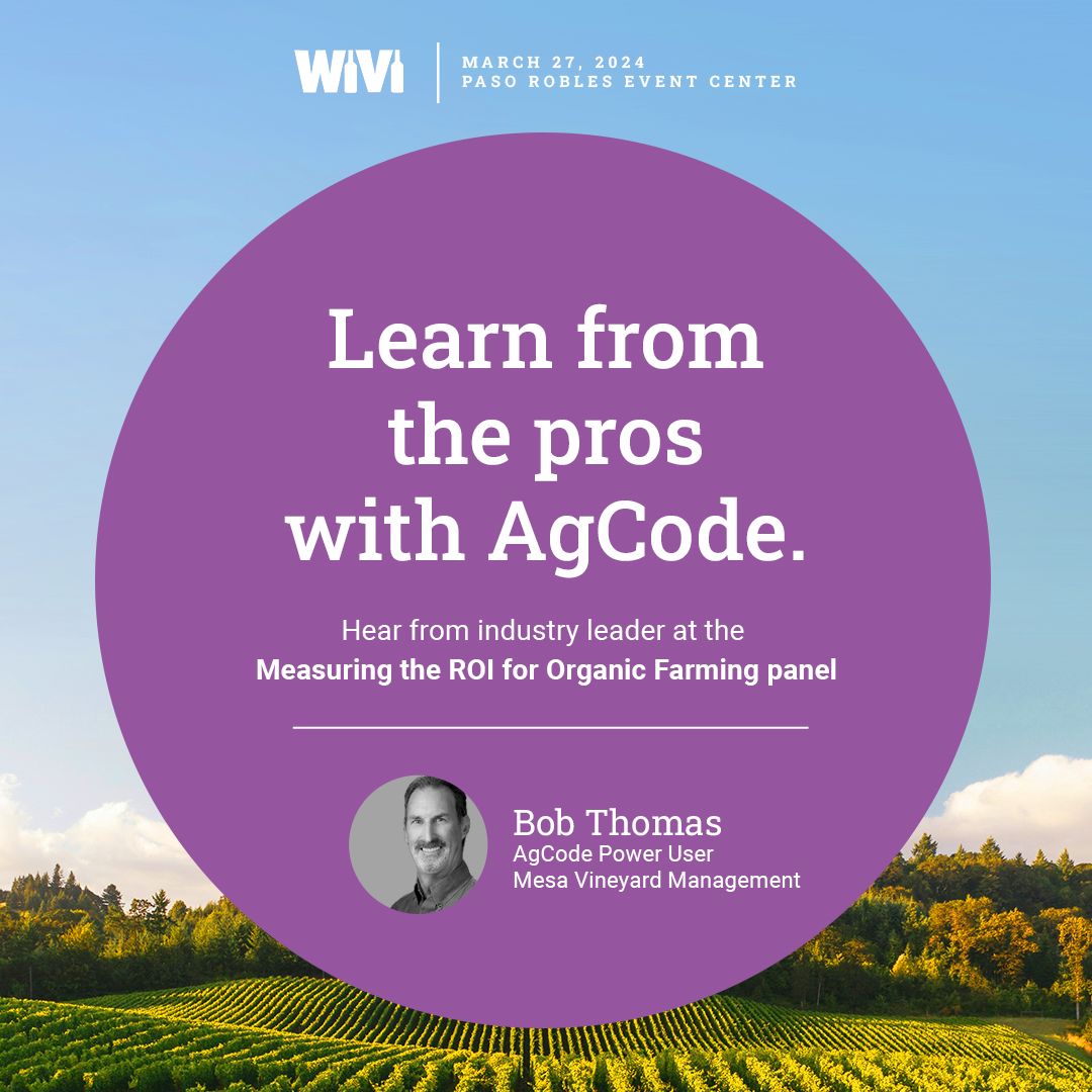 Catch up with the AgCode team at the Measuring the ROI for Organic Farming panel at 12:15p.m. on March 27th at WiVi Central Coast 2024. Hear from experts like Bob Thomas, Vineyard Manager at Mesa Vineyard Management, and other wine industry leaders to learn what practices helped them successfully transition to organic farming.