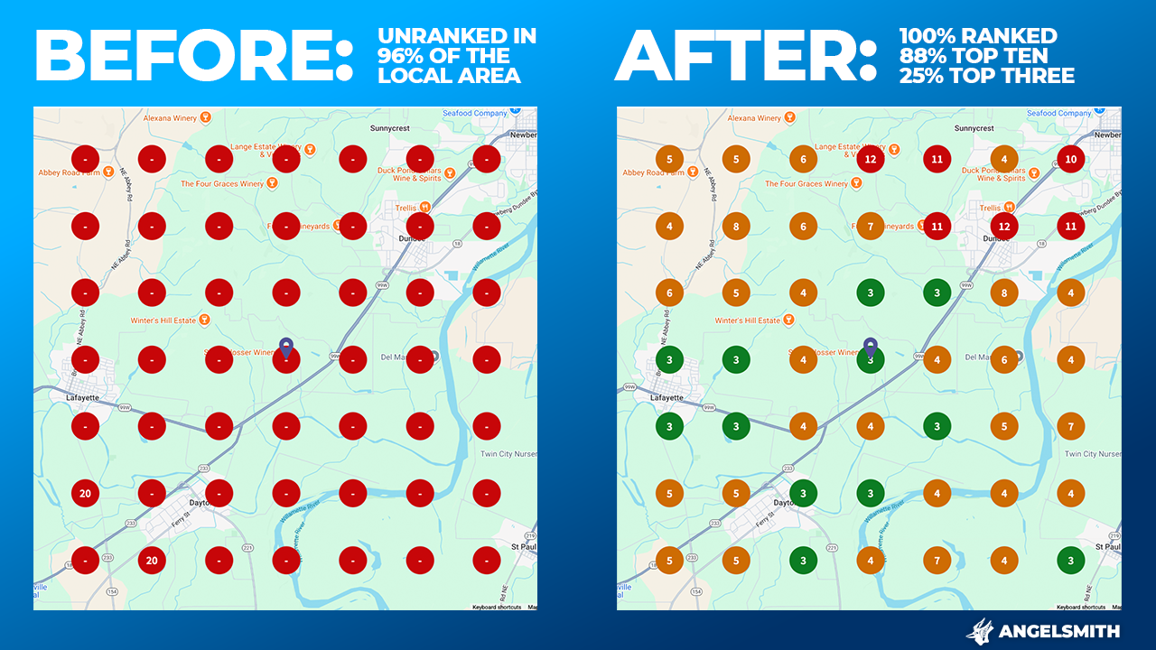 They went from being completely unranked in 96% of their local area to being 100% ranked, with 88% of their rankings in the top ten and 25% rankings in the top three. That means more people seeing them when they search, and more tasting room traffic as a result.