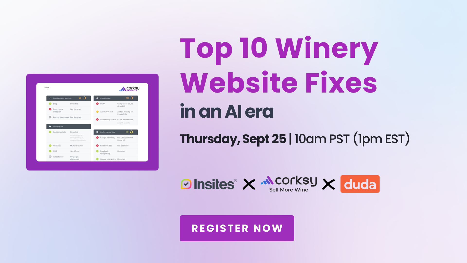 Your winery’s website is the digital front door to your brand — and in the age of AI, it’s more important than ever to get it right. Join experts from Corksy, Duda, and Insites as we reveal the top 10 most common winery website mistakes (and how to fix them), share how AI is reshaping discoverability, and show you simple steps to boost traffic, sign-ups, and sales. You’ll walk away with a clear action plan to make your website work harder for your business.