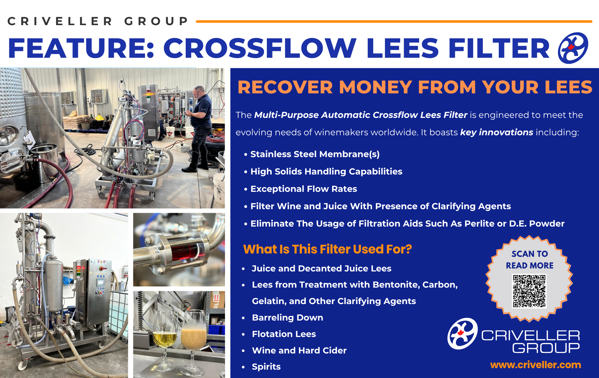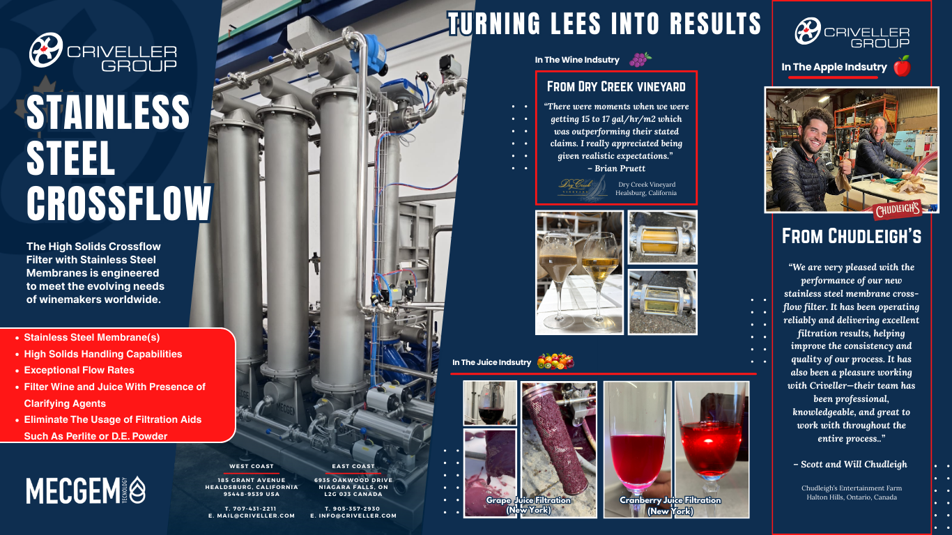“The CFI is a game-changer,” said Davide Criveller, CEO at Criveller Group California. “Its ability to process lees and wine with the same unit gives winemakers more control, better yields, and lower operational costs—all with one streamlined system.”