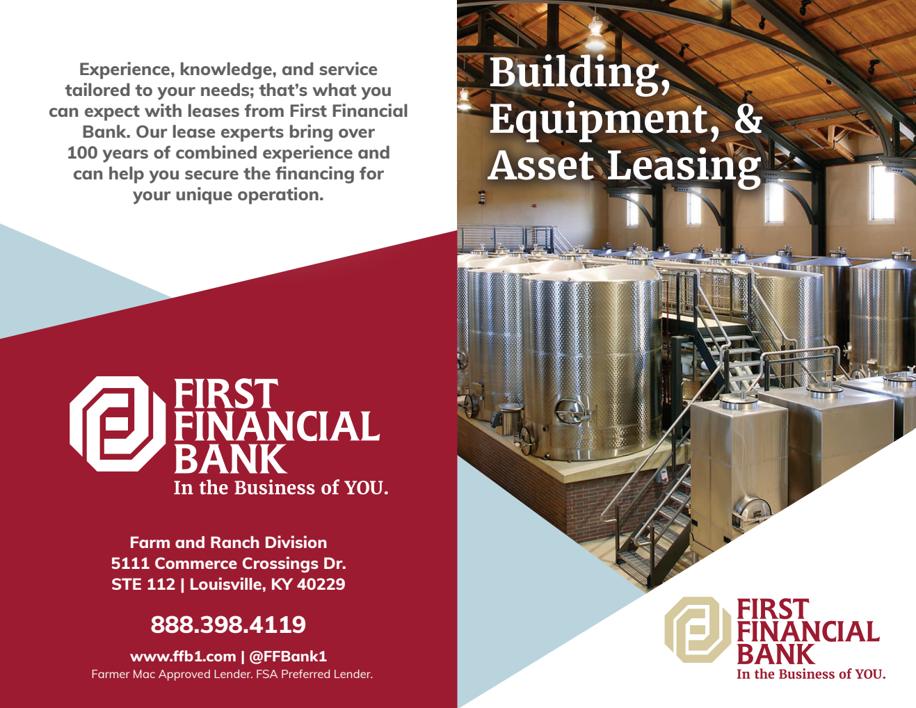 Whether it’s equipment, buildings, or something else, when you partner with First Financial, we can help you invest in your operation without straining your resources. Our goal is to help you preserve your liquidity, optimize your tax deductions, and lease the asset that fits the needs of your operation.