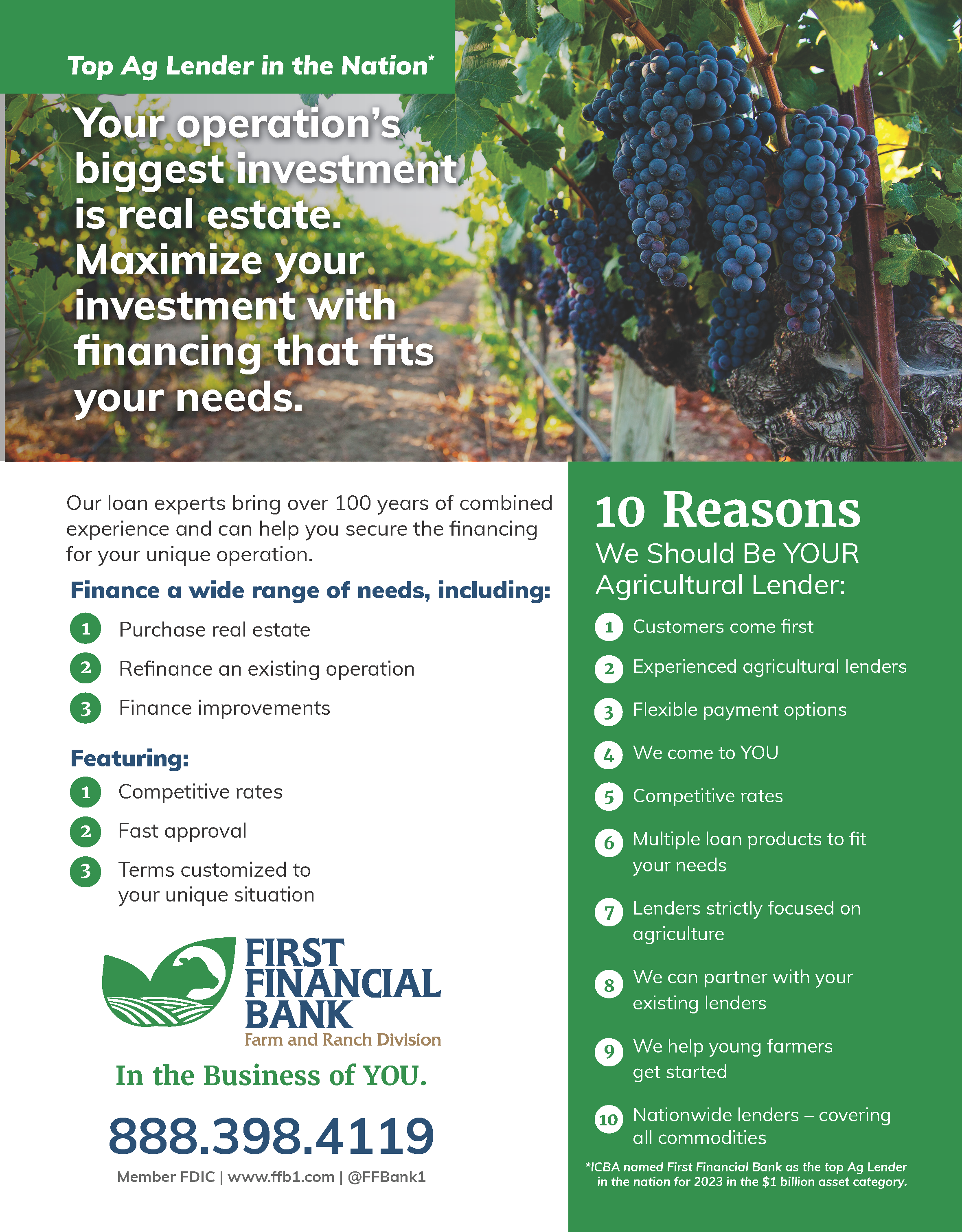 First Financial Bank has a long history of supporting the agricultural community. The bank offers farmers and ranchers a wide range of products and services, including financing for new farms, real estate purchases, equipment and building leasing options, expanding existing operations, equipment, supplies, and more. First Financial Bank is a Farmer Mac approved lender, FSA Preferred Lender in all 50 states, and approved to offer SBA 7(a) loan products under SBA’s Preferred Lender Program. The bank also has a team of experienced agribusiness lenders who provide personalized service to its agricultural customers because they are farmers and ranchers themselves.