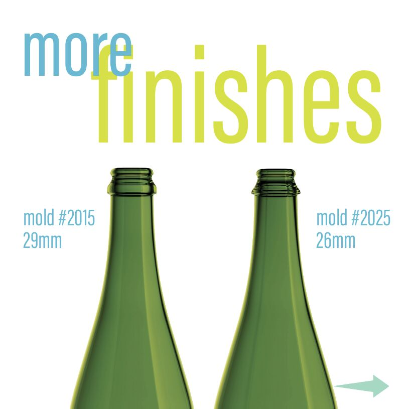 Our portfolio just got more versatile: five new molds, two sparkling wine bottles in 26mm and 29mm finishes, and 11 new colorways—offering more options across both new and existing bottle designs.