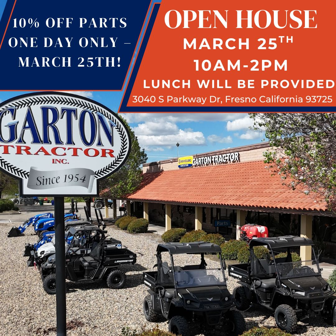 Garton Tractor Fresno will be hosting our Annual Open House on Wednesday, March 25th from 10 AM – 2 PM.