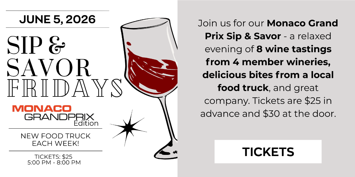 Check out the lineup below and grab your tickets! For just $25, enjoy tastings from four of our member wineries, stroll through our salons at your own pace, and soak in the themed vibes. Local food trucks will be on-site with delicious bites available for purchase to match the evening’s theme.