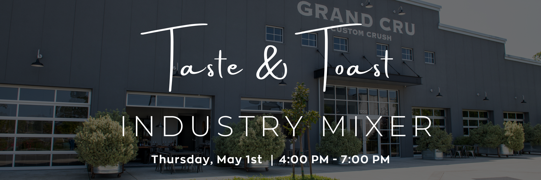 We are excited to invite you to our Taste and Toast: Industry Mixer at Grand Cru Custom Crush on Thursday, May 1st from 4:00-7:00 PM!