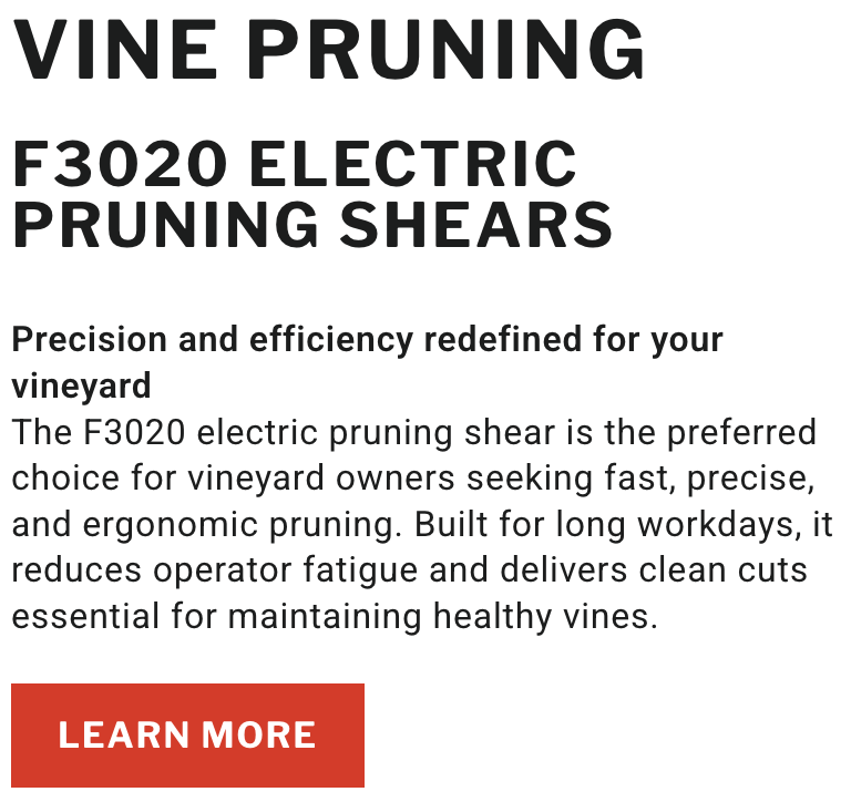 Our best-selling electric tools are for efficient, safe, and productive work. From precision pruning to secure tying and effective olive harvesting, INFACO provides a range of tools to support all stages of agricultural work. Come and experience it yourself at the Unified Wine and Grape Symposium. Come and test our line of INFACO F3020 Electric Pruning Shears. Designed for speed, comfort, and safety, the F3020 is the go-to tool for professional pruning in American vineyards and orchards.