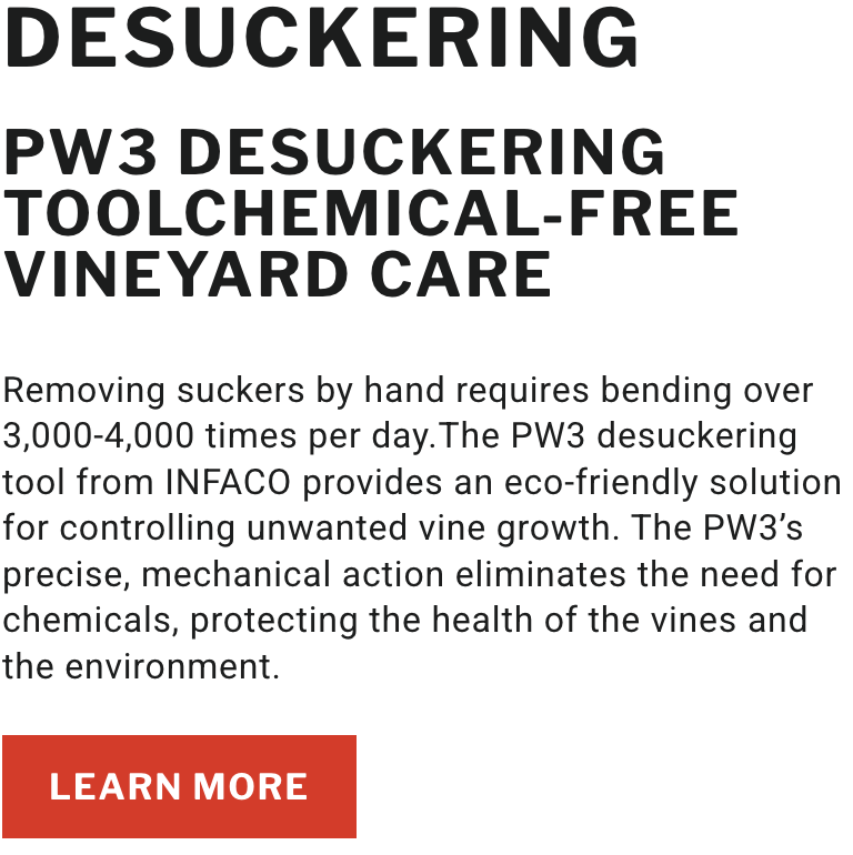 INFACO’s viticulture tools are designed to enhance productivity, improve safety, and support sustainable vineyard practices. Explore our collection of F3020 pruning shears, AT1000 tying machines, and PW3 desuckering tools to take your vineyard management to the next level.