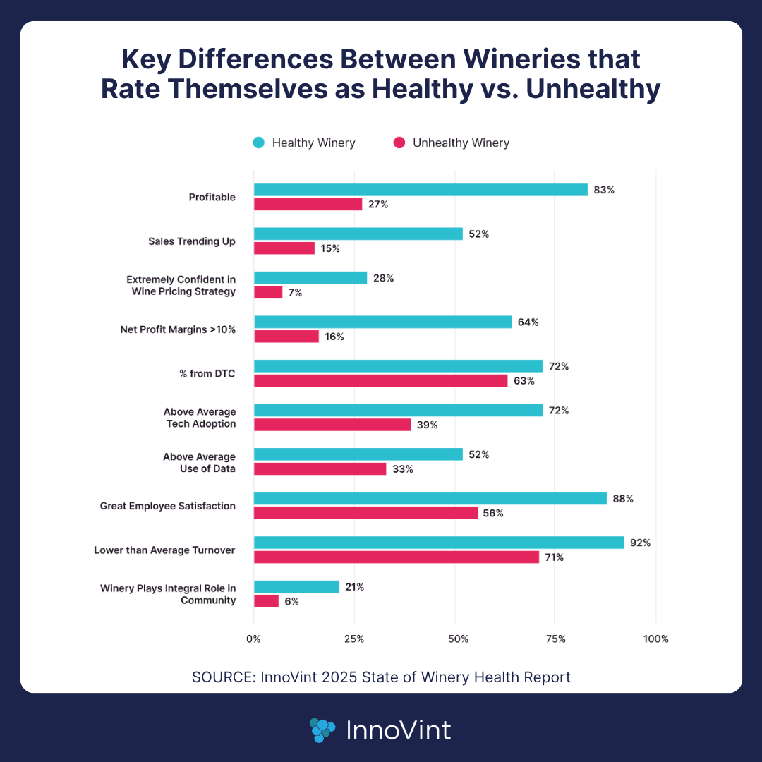- Leaders in tech adoption win big: Wineries embracing modern technology report higher health scores and are 50% more likely to see sales growth.