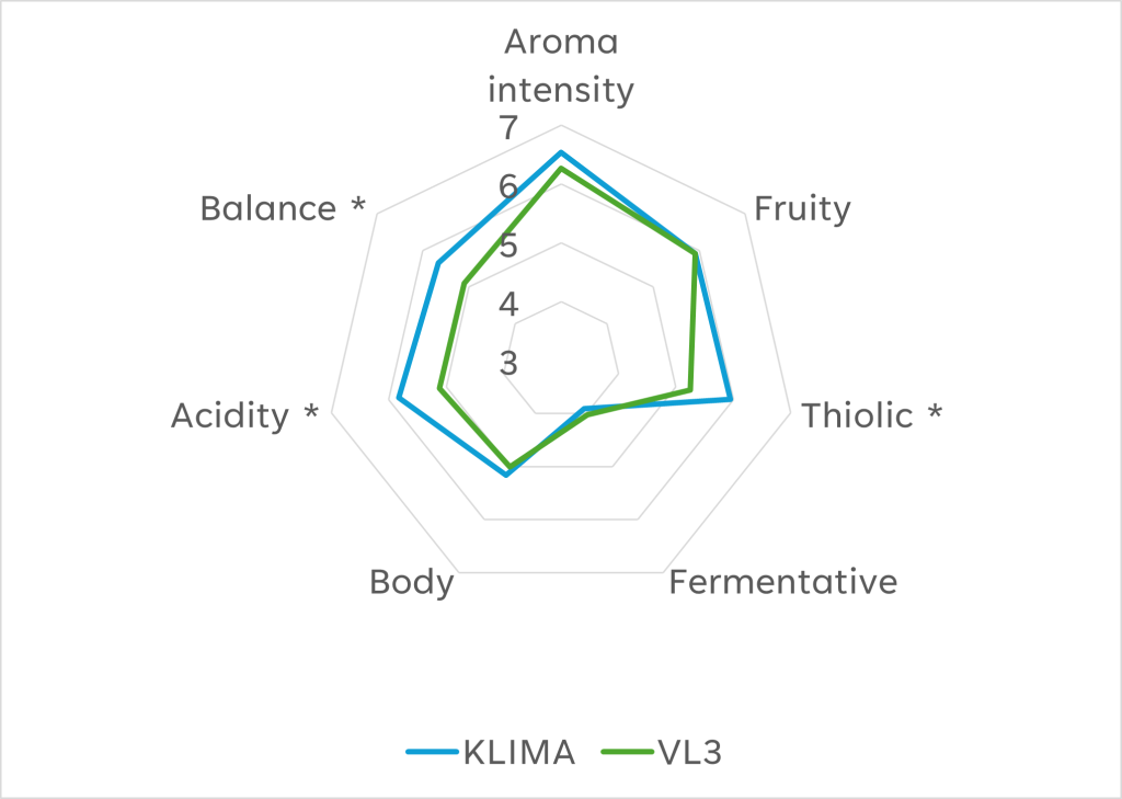 Figure 2: Sensory profiles of ZYMAFLORE™ KLIMA and ZYMAFLORE™ VL3 Sauvignon blanc wines. Mean scores from 84 panellists (1–10 scale); symbol * indicates significant differences (t-test; p < 0.05).