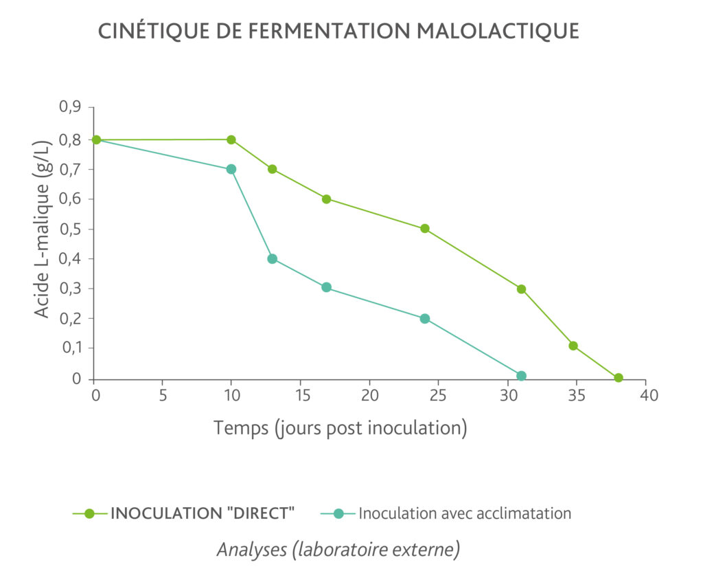 When these factors accumulate, they can become limiting and act as a brake on the onset of MLF, whether expected with indigenous bacteria or with selected bacteria that are poorly adapted to these conditions. LAFFORT® research work on the LACTOENOS® B7 Direct bacteria has made it possible to develop a protocol (with acclimatization) adapted to these difficult conditions.