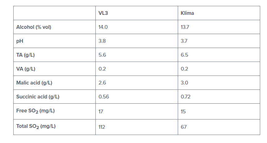 Table 1. Main oenological parameters of dry Sauvignon blanc wines fermented with ZYMAFLORE™ VL3 and ZYMAFLORE™ KLIMA.