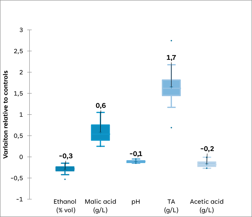 Figure 3: The impact of ZYMAFLORE™ KLIMA on wine analytical parameters compared to control strains. Cumulative data from 20 winery trials (2022–2024) from various winemaking regions (boxplots with highlighted median values).