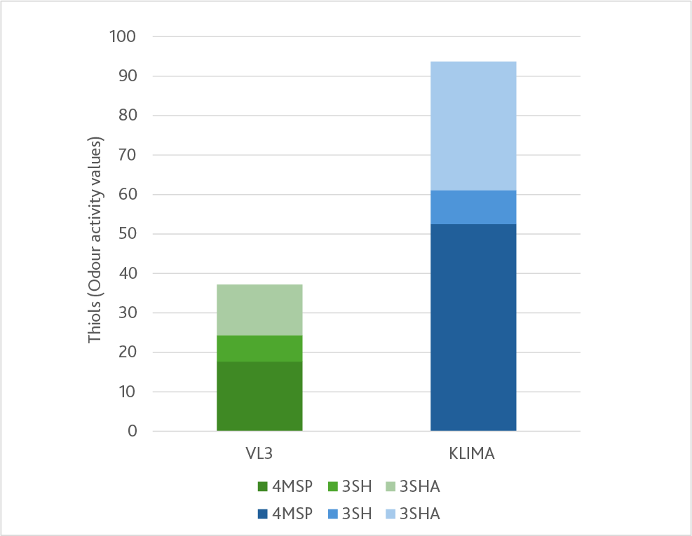 Responses from 84 participants revealed significant differences (t-test, p<0.05) for three descriptors (Figure 2). The KLIMA wine was rated as more thiolic, acidic and balanced than the VL3 control. For a 14% press juice requiring acidity adjustment, KLIMA proved to be the more suitable yeast choice. In contrast, VL3 is better suited to leaner matrices that benefit from enhanced mouthfeel imparted by this strain.