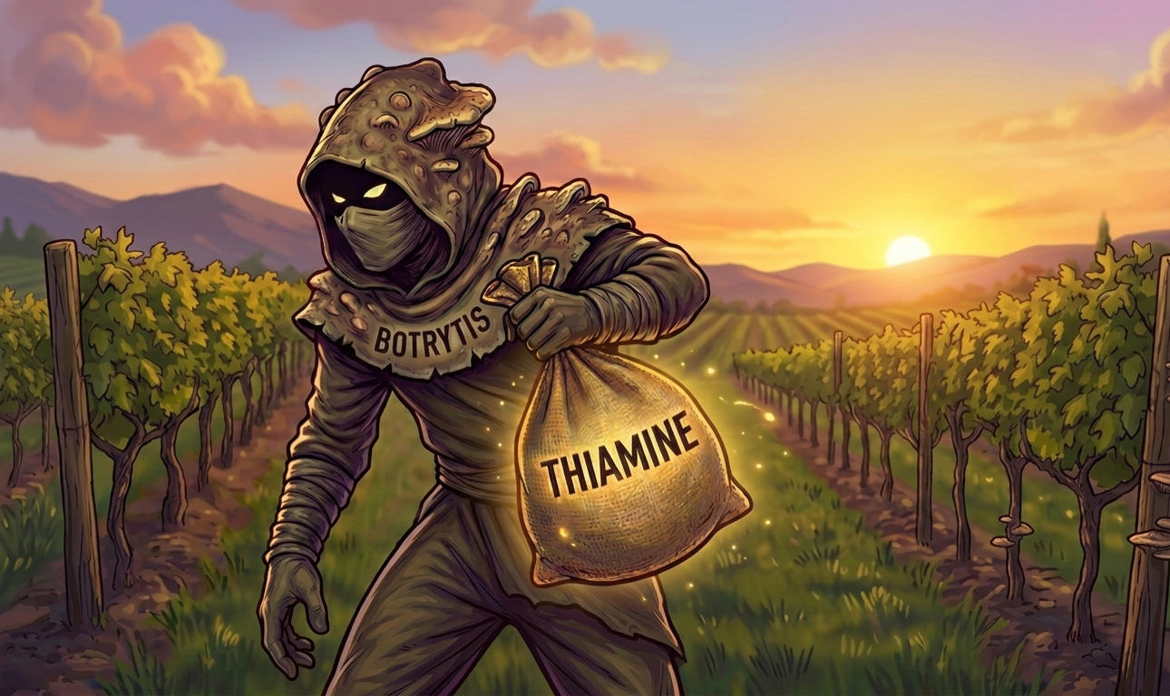 Several factors can deplete thiamine before or during fermentation. Fungal infections, such as Botrytis cinerea, reduce the thiamine content even before harvest. Indigenous microflora present in the must can consume significant amounts of thiamine. High SO2 additions at the crusher can also chemically degrade some thiamine. During thiamine deficiency, metabolic pathway bottlenecks occur, leading to the accumulation of intermediary metabolites. Some of these metabolites are known to bind sulfur dioxide (SO2). This poses a potential problem in the finished wine because SO2 additions to achieve sufficient free SO2 for preservation might increase total SO2 levels beyond the legal threshold.