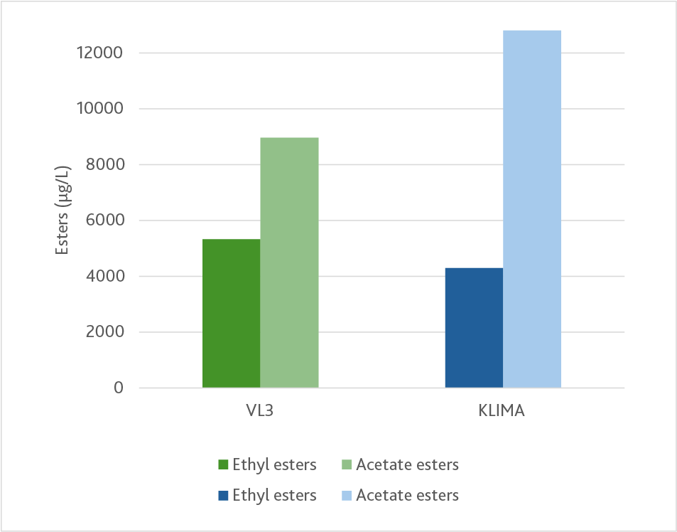 Compared to the VL3 control, representative of ‘classical’ S. cerevisiae wine strains, KLIMA wine contained 0.3 % vol. less alcohol (Table 1). It also showed a lower pH (0.1 unit) and higher TA (0.9 g/L). This was associated with an increase in malic acid, 0.4 g/L more than in VL3, and 0.2 g/L more than in the initial juice. Succinic acid was also slightly higher in KLIMA, as the production of malate and succinate is positively correlated in ‘ACIDIC’ strains (5). Volatile acidity remained similarly low in both wines (0.2 g/L), while lower total SO₂ levels in the KLIMA modality suggest a decreased formation of sulfur-binding compounds by this yeast.