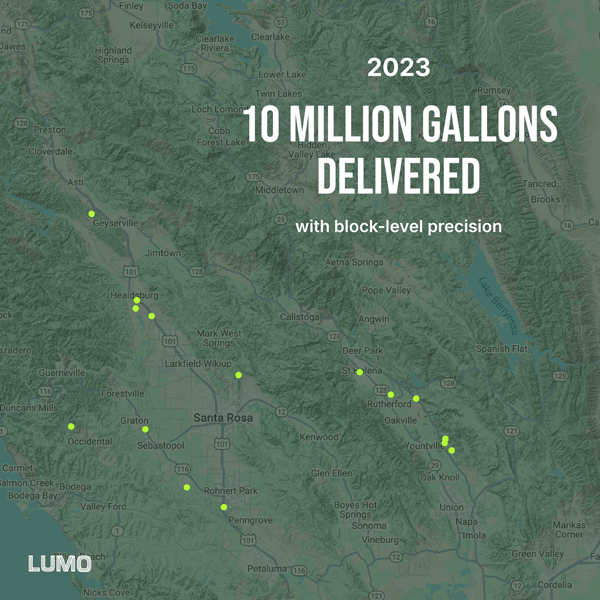 Over 150 ranches in Napa, Sonoma, the Central Coast, the Okanagan Valley and Washington State are already using Lumo’s precision irrigation system to close their execution gap, increase operational efficiency, and irrigate to plan. In July alone, Lumo’s system delivered over 150 million gallons of water with block-level precision.