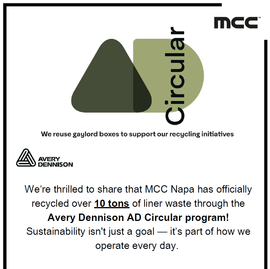 Big news from MCC Napa — we’ve officially recycled 10 TONS of liner waste through the Avery Dennison AD Circular Program!