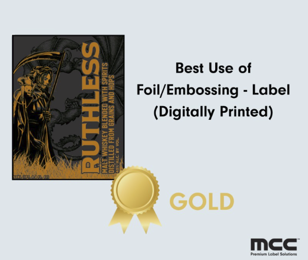 π₯ Gold: Best use of foil/embossing – label (digitally printed) for Ruthless Malt Whiskey by St. George Spirits