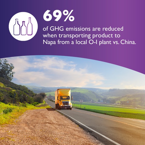 Sustainability initiatives often target material ingredients and manufacturing practices, leaving transportation an overlooked part of the puzzle. Transportation can make a significant impact. According to O-I calculations, GHG emissions from transportation can be reduced by 69% when transporting from an O-I West Coast plant to Napa as opposed to transporting from China to Napa.* Purchasing glass from a local supplier reduces the miles that glass must be transported, lowering carbon emissions.