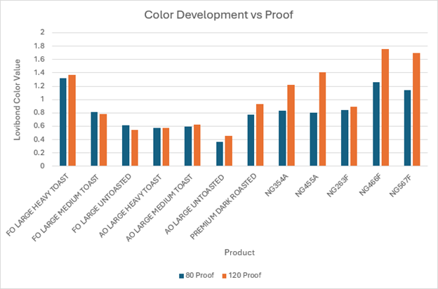- At 120 proof: Darker-toast levels extracted more color, as the alcohol dissolved more toast-derived compounds.