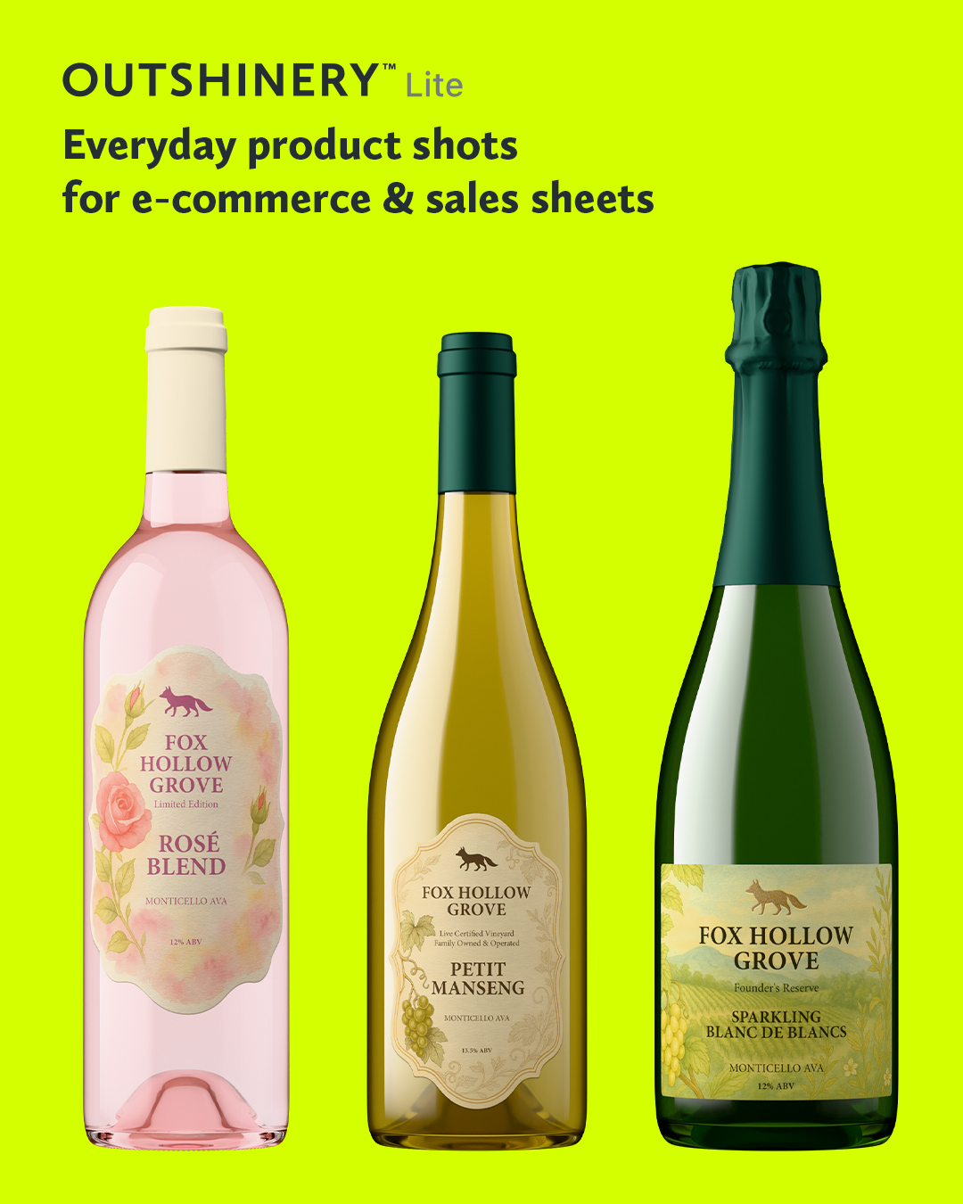 Outshinery Lite is built on the same 3D production expertise behind Outshinery Studio, the company's premium, human-crafted imagery service used by more than 2,000 beverage brands worldwide. While Studio handles complex packaging, custom glass, and specialty finishes through trained 3D artists, Lite delivers standard wine bottle shots in under one hour from a label upload. No physical sample is required.