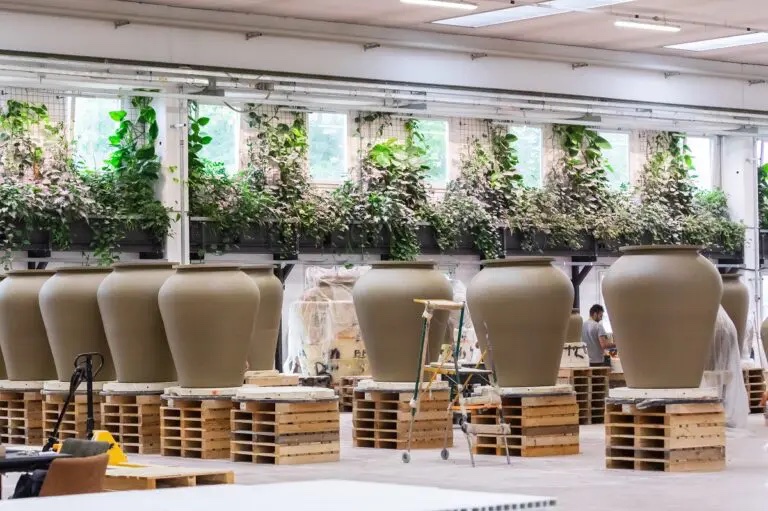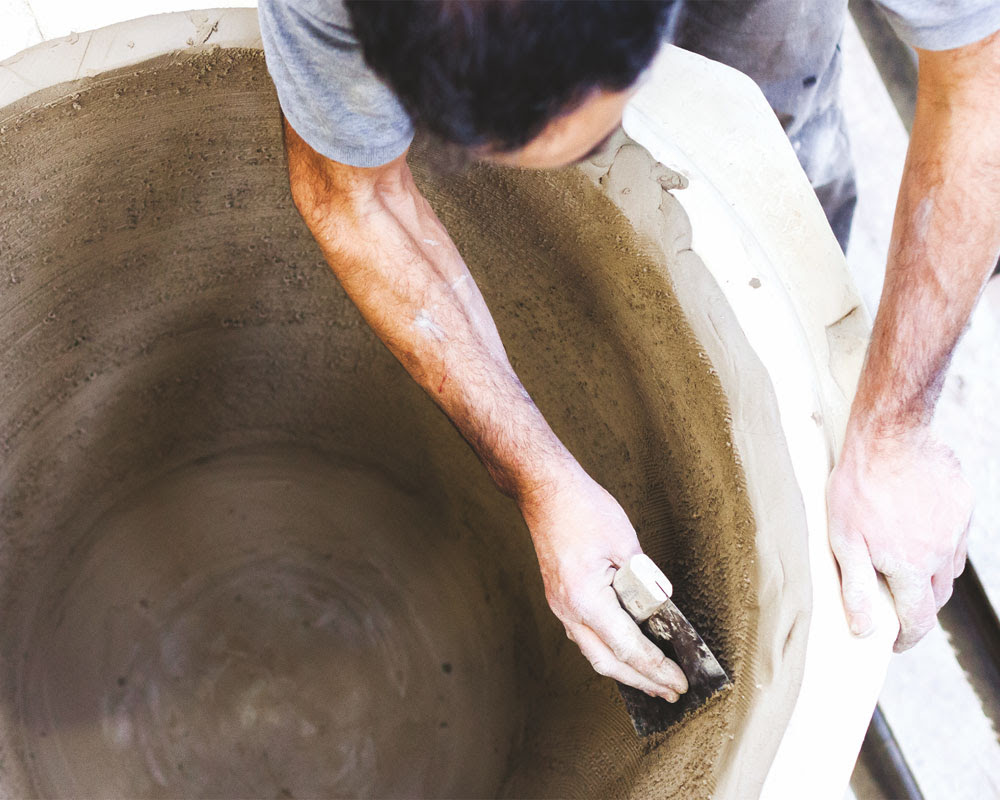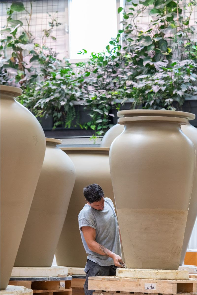 TAVA amphorae are entirely made by hand via setting ceramic clay in molds and are then fired at temperatures between 2192F and 2300F. The higher the temperature you fire at, the smaller the pores are on the amphorae, and hence the lower the porosity. During the initial drying process, humidity and temperature are controlled via evaporative coolers and the presence of vegetation inside the production site. The presence of vegetation is crucial for regulating humidity and temperature levels, thus bringing countless benefits to both worker's conditions and the final product. Each amphora produced has a serial number for complete traceability.