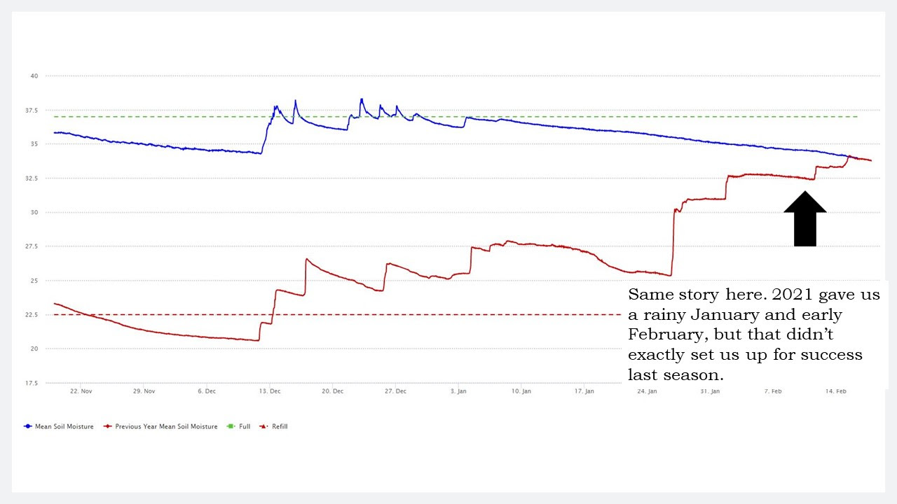 Below is a Napa site. Now keep in mind, we had some rain in February of 2021, but as you can see the moisture reserves that we accumulated in the fall have left us exactly where we were last year, and that’s not a comforting place to be…