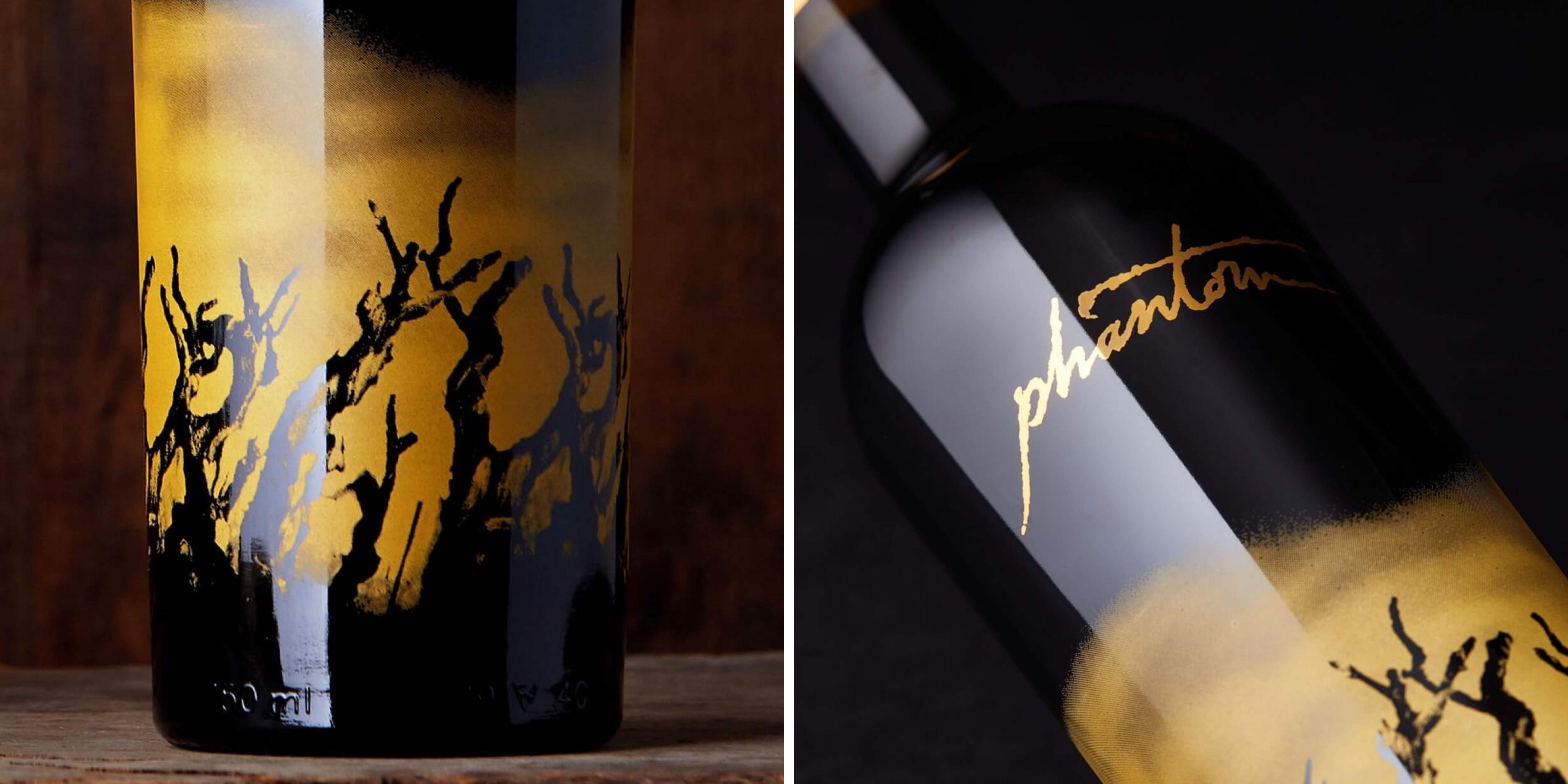 The design wraps around the bottle and is accentuated with an elegant, 22-karat gold Phantom logo. The design is a half wrap fog gradient with feathered edges to portray slow fog creeping in through the vineyard.