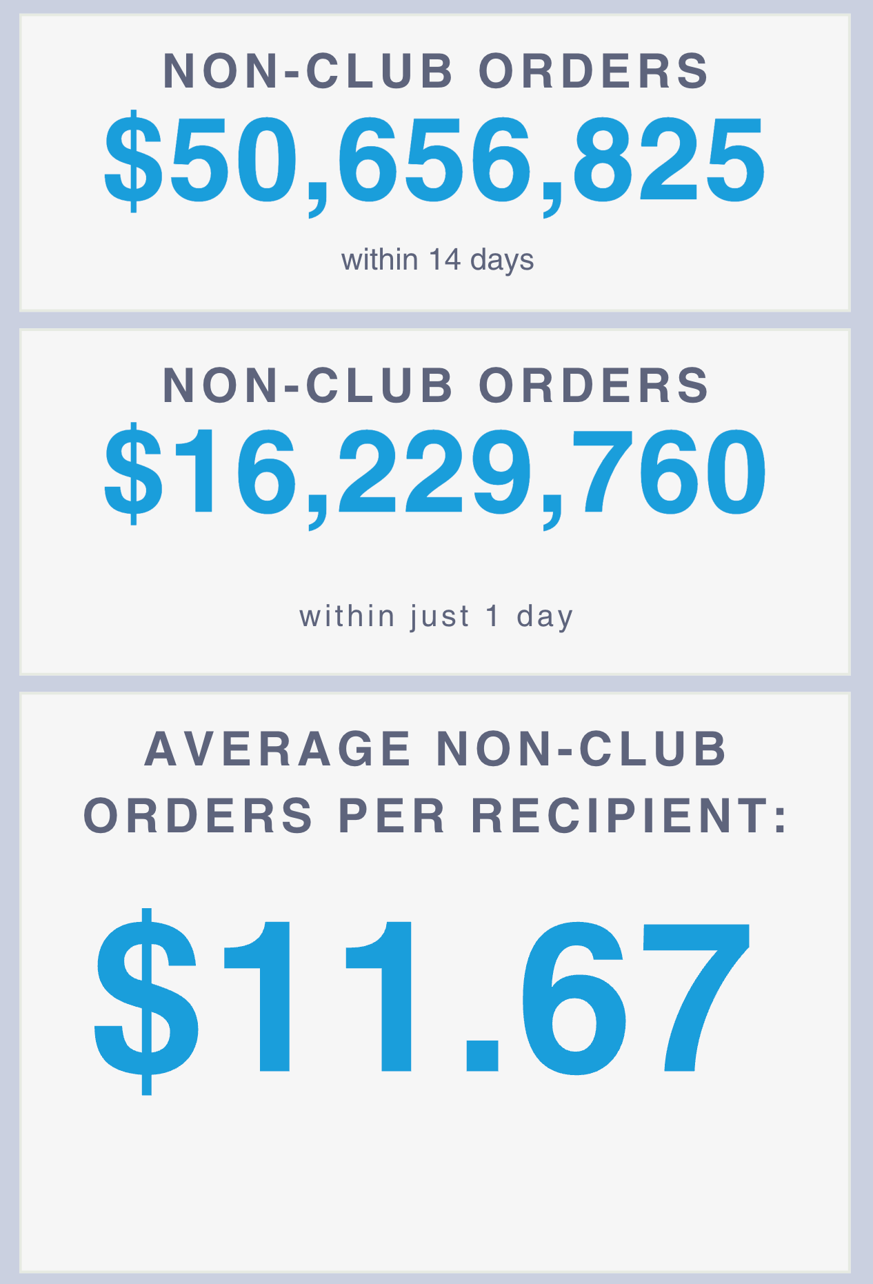 Not all of these messages were meant to drive non-club sales; for example, surely hundreds of the 4,894 Bulk Messages included in this analysis were meant instead to remind members about customizing their club, to pick up purchases already made, to resolve declined payments, etc. Although these messages are included in the total number of 4,338,837 recipients, it’s important to note that the club-related sales they generated are not included in the attributable orders above. Even given this extremely conservative analysis, the average Bulk Message still generated $11.67 of non-club sales per recipient!