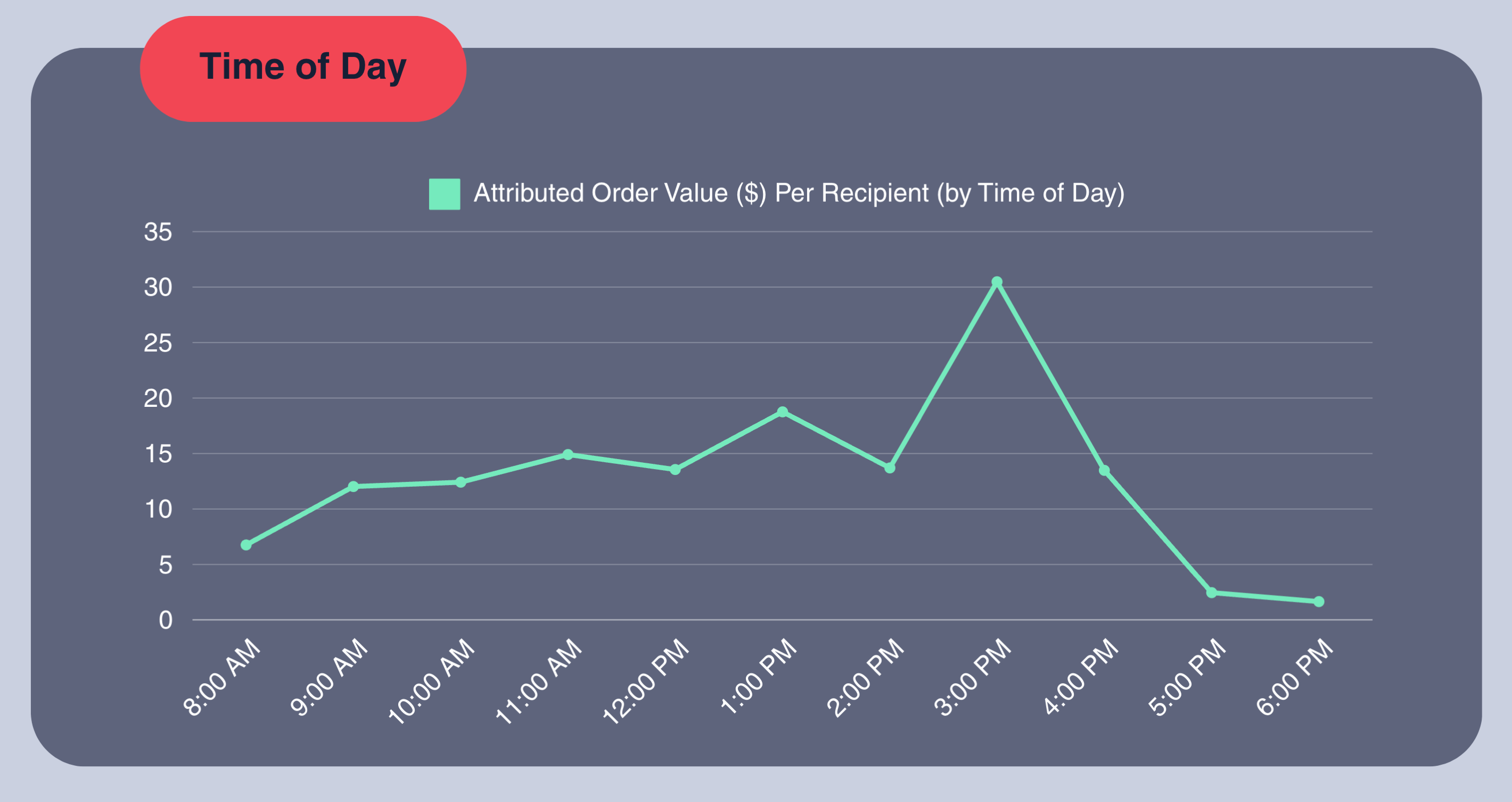 This graph shows order attribution per recipient by time of day the message was sent, bracketed by hour.