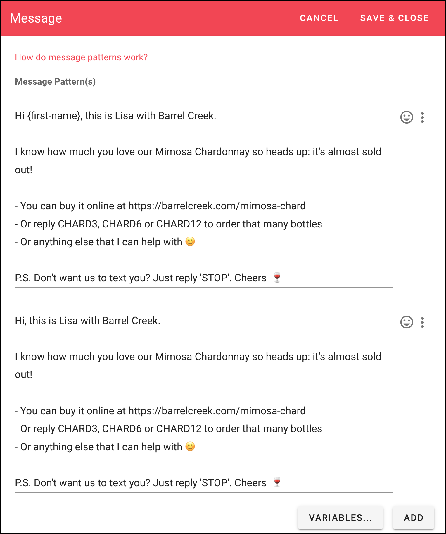 - Take advantage of RedChirp’s Message Patterns to create a version of your Bulk Message that includes the {first-name} variable, and then a second message pattern that does not. RedChirp will try to create the message in your first pattern. If it’s able to create it, great! It will send that message and stop. But….if it runs into a problem and can’t fill in one or more variables —maybe your first name data is missing for the 857th recipient — it will move on and try to create the 2nd pattern instead. This makes sure you never send something embarrassing like, “Hi {first-name}!”.