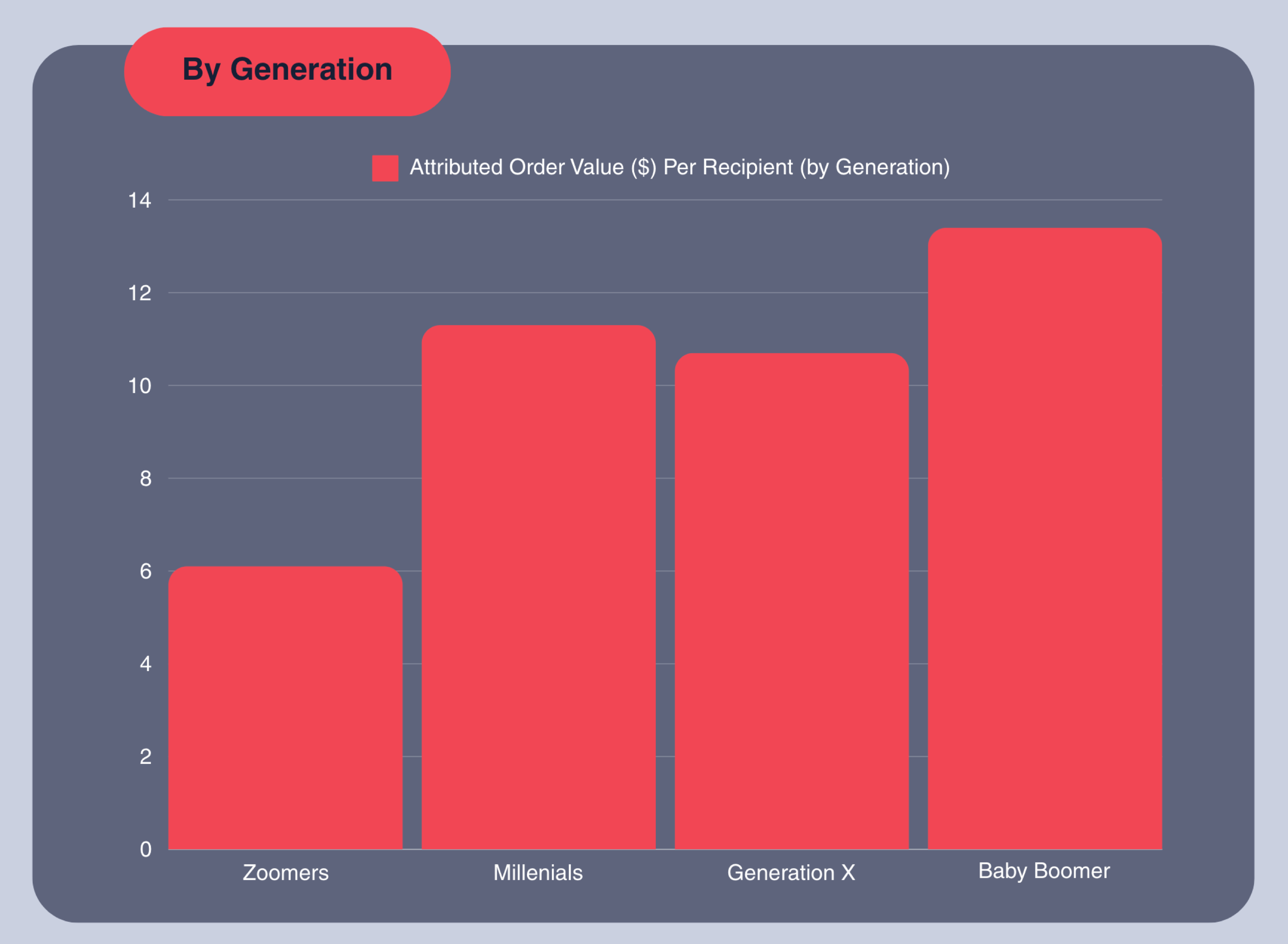 We sliced up the orders these Bulk Messages generated by generational demographics (as defined in https://en.wikipedia.org/wiki/Generation) and found nearly even distribution among Millennials, Gen X, and Baby Boomers, with Baby Boomers performing slightly better than the rest.