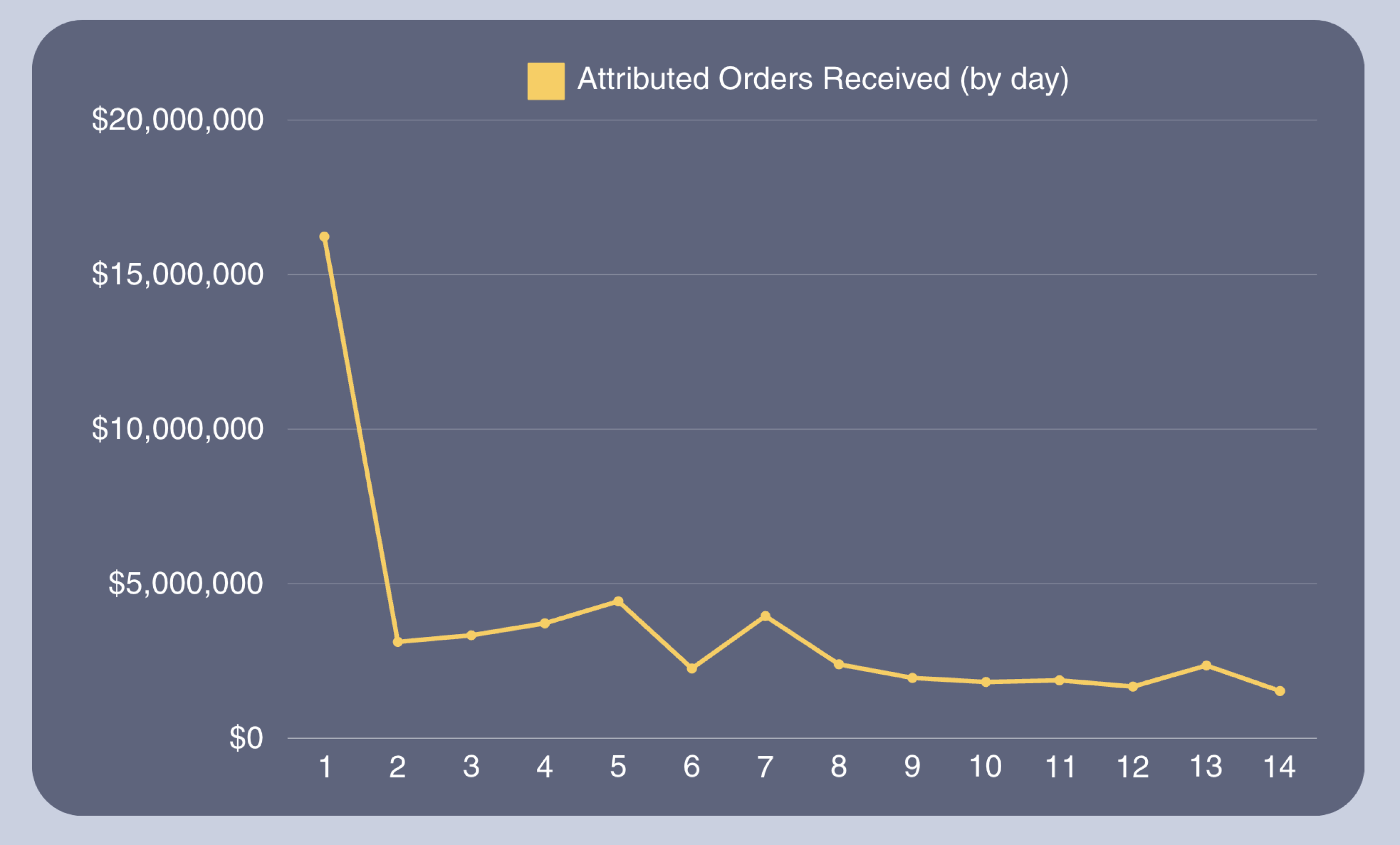 The total order value was impressive, but it was also powerful to see the distribution of these over time. Most of these orders — $16,229,760 (about one-third of them) to be exact — happened right away. That shows how clear and immediate the connection was between receiving the message and making the purchase.