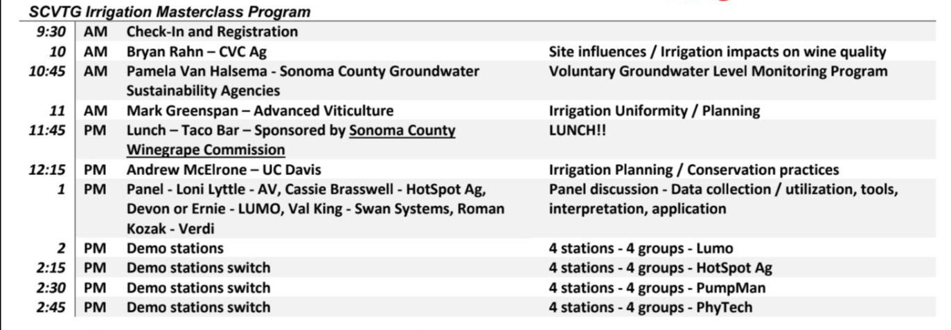 Mark your calendar for the Vineyard Irrigation Master Class organized by the Sonoma County Vit Tech Group. Advanced Viticulture is a proud sponsor and AV's own Mark Greenspan and Loni Lyttle are both speaking at the event.