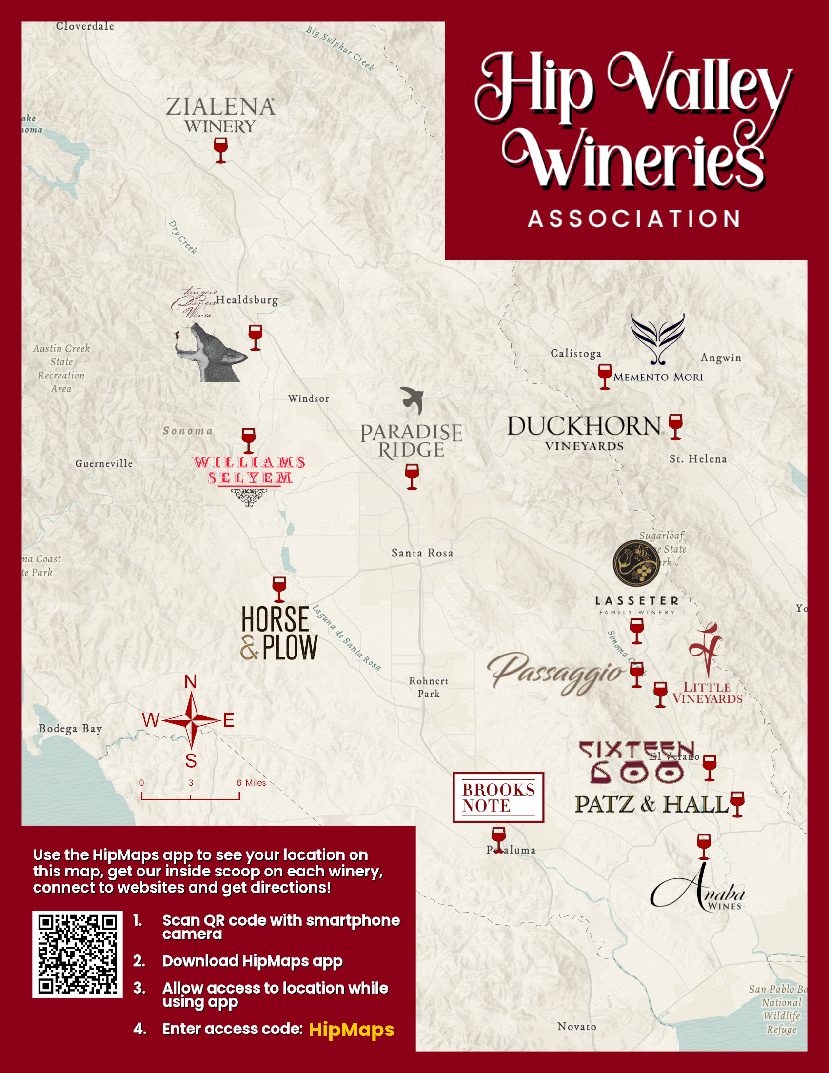 Ready to see HipMaps in action? Check out our sample map of a pretend winery association – featuring real wineries that we love! Scan the QR code on the HipMap below or go to Apple’s App Store or Google Play. Download the HipMaps app, allow access to your location while using the app, and enter the access code HipMaps