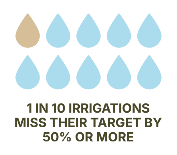 The central finding is that irrigation system performance is highly variable at an individual block level—one in ten irrigations miss their target volume by 50% or more and three in four irrigations miss by 10% or more.