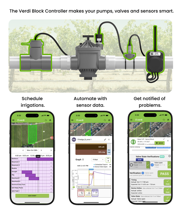 Verdi allows irrigation to be managed on multiple properties manually, remotely, with schedules and by having farm sensors tell the system when the crops need more water. It also tells them when there’s problems, so they always know if their watering systems are functioning properly.