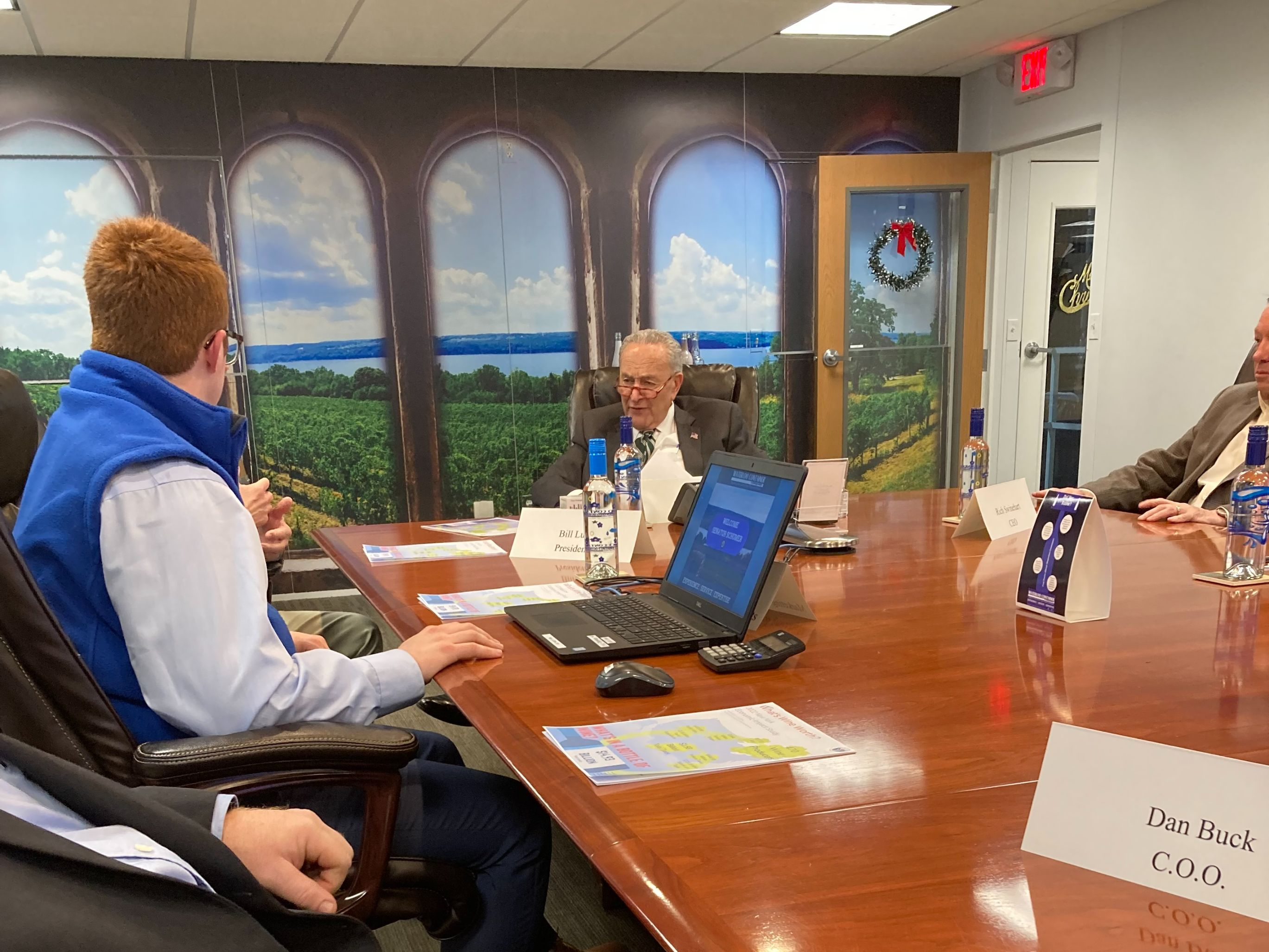 WATERLOO, NY–Senate Majority Chuck Schumer met on Friday, December 2 with leaders of WineAmerica, the National Association of American Wineries, and owners of Waterloo Container, a large supplier of bottles to the American wine industry located in the fabulous Finger Lakes wine region of upstate New York.