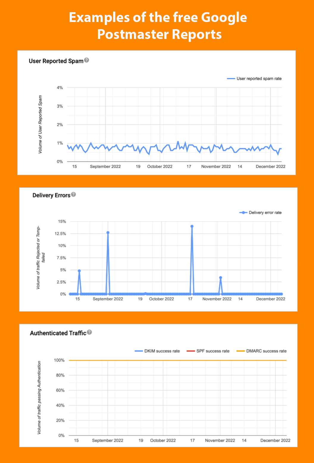 For many email marketers, this might be the most confusing of the new guidelines. How are you supposed to know your overall complaint rates – especially if you’re using multiple senders? This seems overly complicated, but it can be tracked at the domain level. The easiest way to do this is to register your sender domain with Google’s Postmaster Tools which will monitor your email performance. Setting up Google’s Postmaster Tools requires verifying your domain with Google via a TXT DNS record. Once your domain is verified, Google will start collecting data. It may take some time though to receive your report as it depends on how frequently you send emails. Google Postmaster Tools are free and offer reports on Spam Rates, IP and Domain Reputation, Feedback Loop, and Authentication and Delivery Errors.
