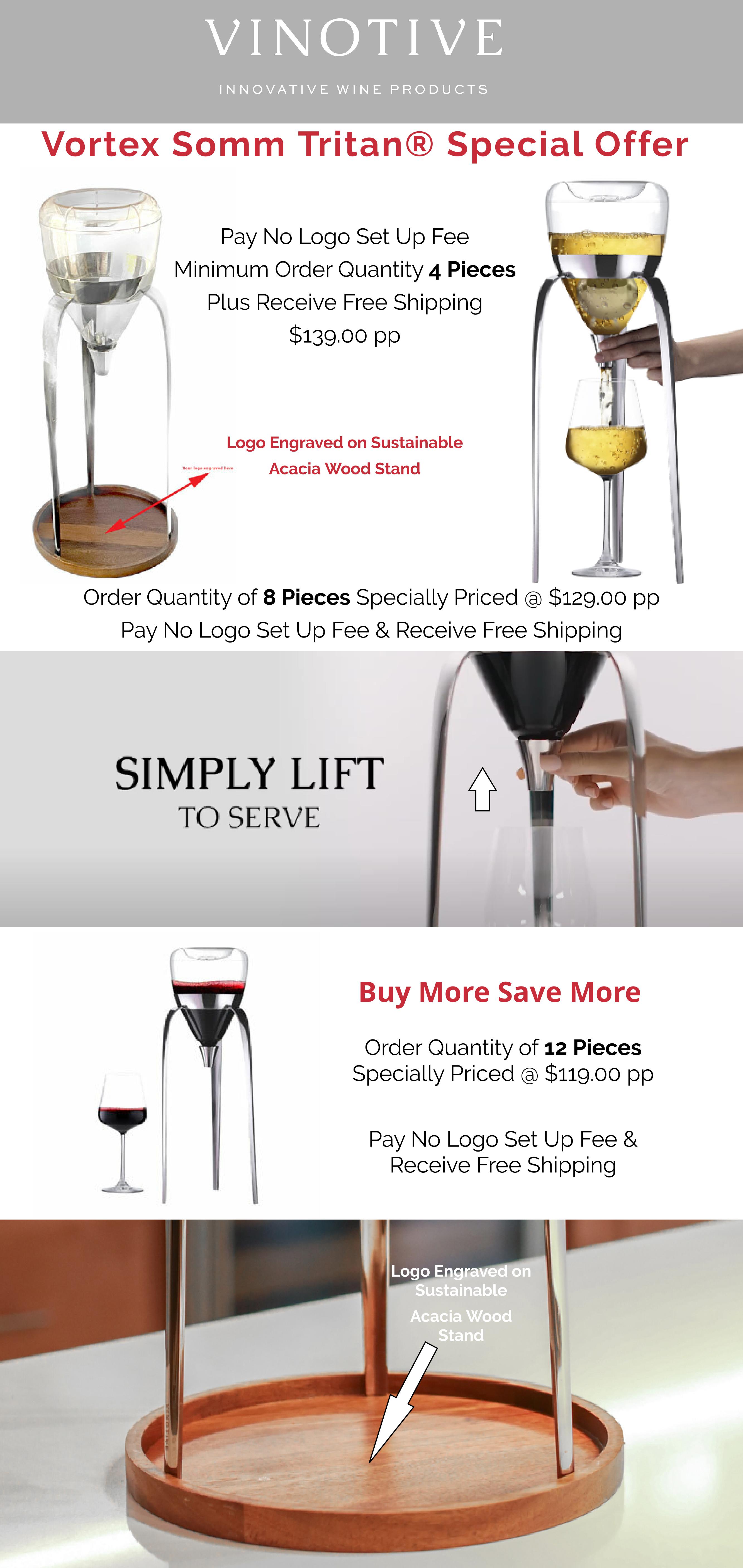 Free Customization on these eye-catching, functional, full-bottle Vortex Aerators, plus we have reduced the MOQ to just FOUR pieces including your logo.