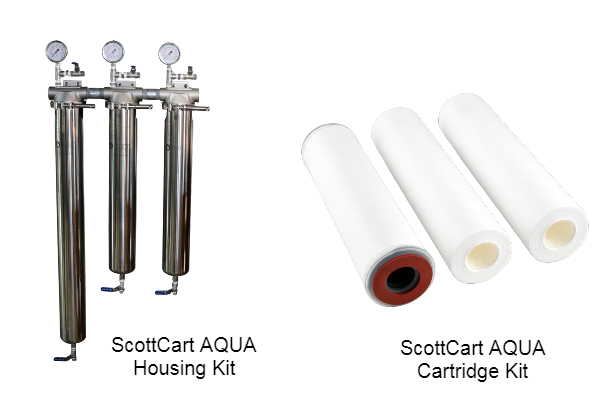 The ScottCart Aqua system is composed of a Housing Kit, which includes a complete set of stainless-steel housings, valves and pressure gauge combinations, connectors, stands and brackets.