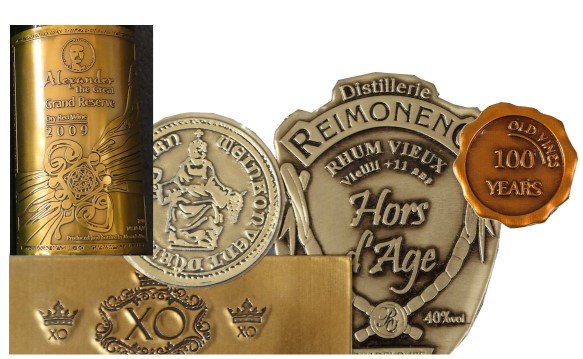 …such as gold coloring, a crest or even a cartouche.” You can save with a lighter-weight bottle and still add considerable shelf appeal with a judicious use of decoration and a quality-embuing label. Global Package’s decades-long partnership with pewter label maker, Etiq’Etains—the French manufacturer that is known worldwide for innovative and beautiful tin, pewter, labels—gives us important leverage when purchasing pewter, tin, and gold-foil labels.