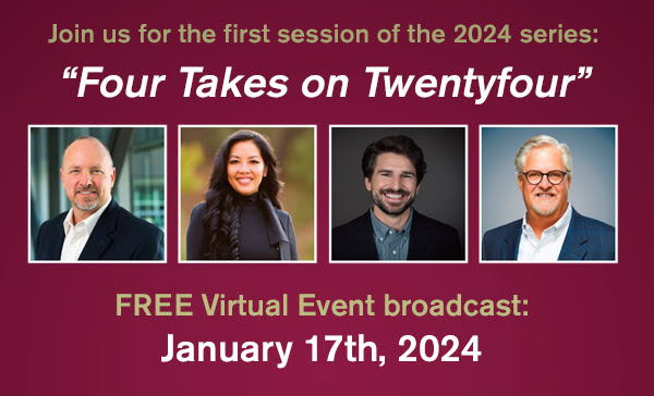 Kicking off the 2024 edition of Bold Predictions, titled “Four Takes on Twentyfour”, we are bringing back moderator Damien Wilson, Hamel Family Faculty Chair of Wine Business Institute and panelists Dale Stratton, Managing Director / Azur Associates, Philana Bouvier, President / Demeine Estates and Bourcard Nesin, Industry Analyst / Rabobank. Joining last year’s panel will be Chris Bitter, Senior Wine & Grape Analyst / Terrain all there to revisit some of last year’s “Bold Predictions” along with sharing their insights and thoughts on what we can expect for our industry in the year ahead.