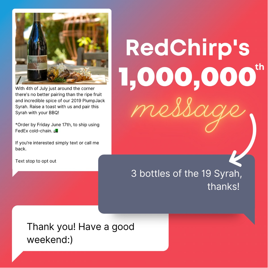 The one-millionth message came from a customer of The Plumpjack Collection. He replied to a bulk text reminding customers to order their 2019 Syrah in time for their 4th of July BBQs.