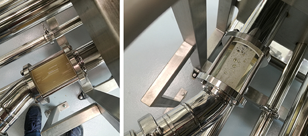 Solubilized product before and after the SMART FILTRATION stage. The product is now filtered and stabilized, ready for packaging.