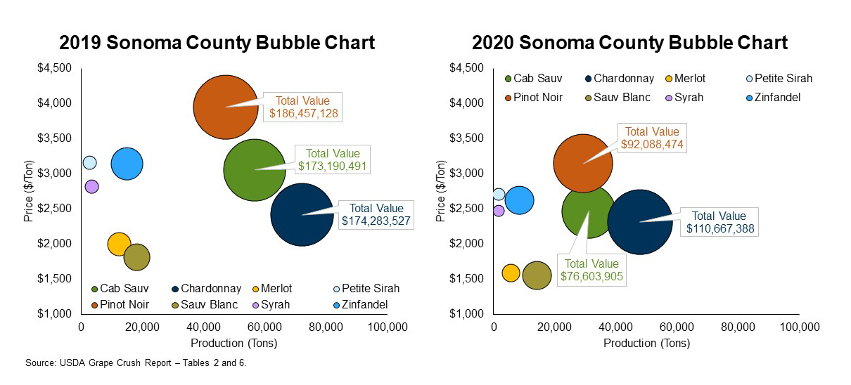 Revenue from agritourism also declined in 2020 as travelers stayed home. Analysis from Wines and Vines, and others, would indicate that total wine sales, in dollar terms, declined modestly while total volume sold increased slightly from a year ago. Moreover, in March the USDA reported a nearly 14 percent decline in the volume of grapes crushed and around a 16 percent decline in the average grape price compared to 2019.