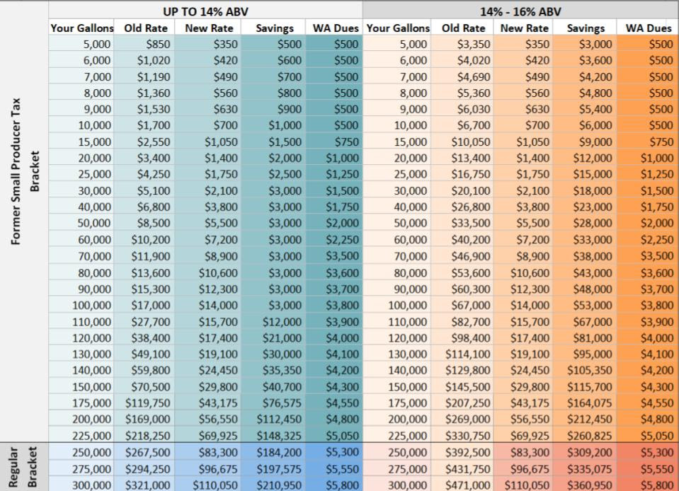 NOTE: The "Old Rate" column reflects the former Small Producer Tax Credit rate, so underestimates the true savings for wineries of many sizes. Also, the orange columns reflect the fact that wines of 14-16% abv are now considered table wines for tax purposes, leading to huge savings.